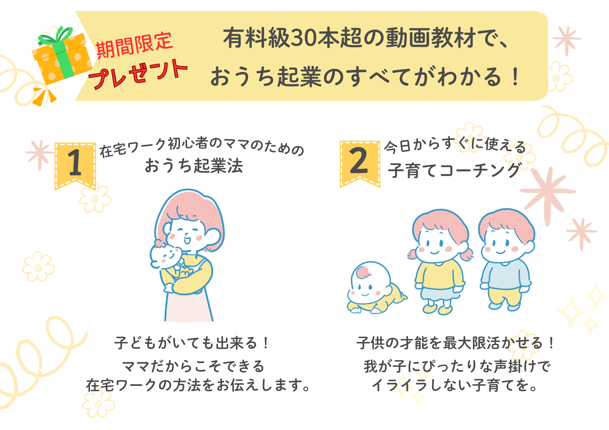 簡単にメールアドレスを登録するだけでもらえるプレゼントには【初心者ママにぴったりなおうち起業の始め方】と、【あなたの子育てに役立つ子育てコーチングのノウハウ】の30本以上の動画が入っています。