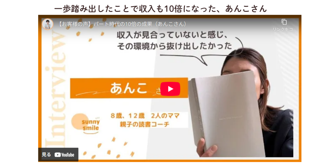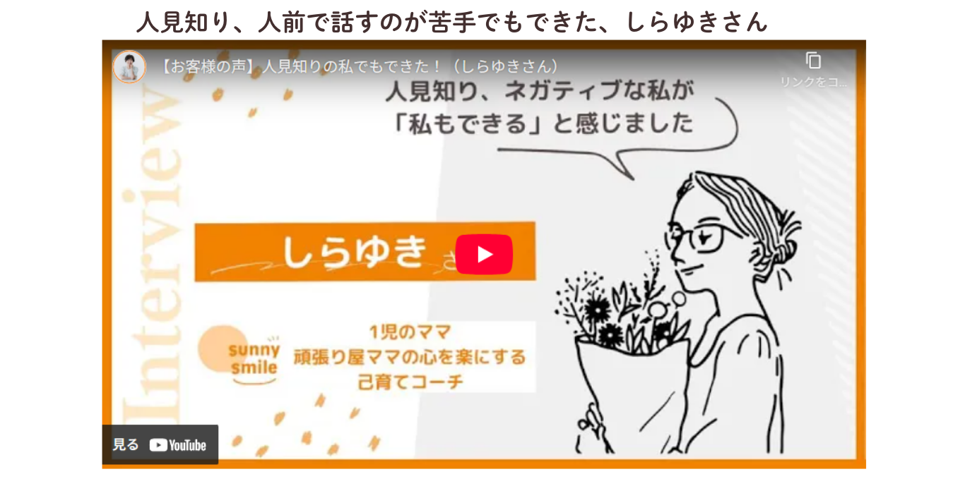 子どもから笑顔がなくなっていったのが苦しくて、どうにかしたいと思い子育てコーチングをスタート。起業したものの、人見知りで人前で話すのが苦手。顔出ししないといけないのかな?と心配だったそうです。あることをすることで安心し、「私でもできます」と言えるように変化されました。子どものために働き方をどうにかしたいと思っている方は、ぜひこの動画を見てくださいね。